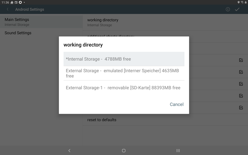 Typically you will also see "removable [SD Card]" as explanation. If available this directory really is located on an external SD card. If you plan to use this, just be sure to always have the SD card installed, when you run AvNav. If you remove it while AvNav is running it could crash. Other apps like a file manger can access the data. The location is [SD card]/Android/data/de.wellenvogel.avnav.main/files (or [SD card]/Android/data/de.wellenvogel.avnav.main.beta/files). Not available before version 20250822. |